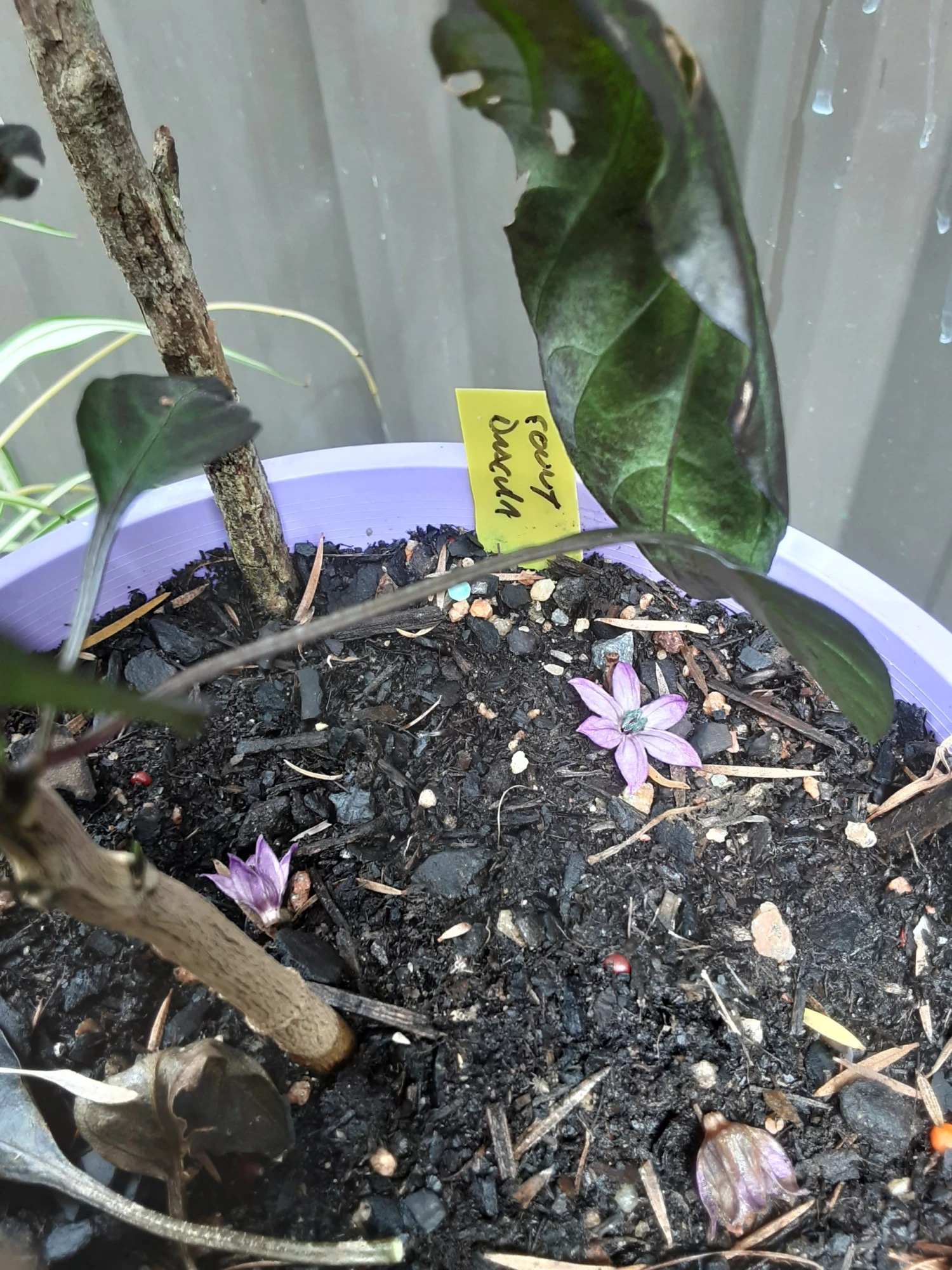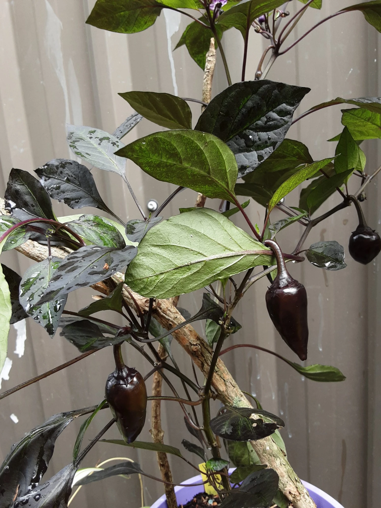 A rare compact chilli bush (up to 45cm) with large glossy dark green and black leaves. Easy to grow and produces good heavy crops of ‘fang’ shaped fruits that start as black as night and ripen to blood red!