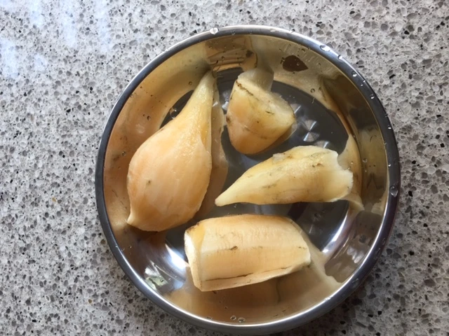 Once the plant dies back in winter, it can be dug up and separated into the reddish colored rhizomes (kept for planting the following season) – and the large brown tubers which can be eaten raw or cooked. The tubers have a crunchy texture like apple and a unique flavor (a cross between apple, cucumber and watermelon).